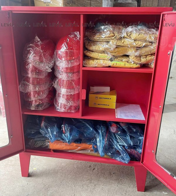 Tủ đựng thiết bị bảo hộ lao động PCCC 1100x1200x400mm được trang bị khóa an toàn nhanh dễ mở và hệ thống chia ngăn thông minh cho phép sắp xếp dụng cụ một cách khoa học, đảm bảo dễ dàng kiểm soát và sử dụng khi cần. Kích thước lớn 1100x1200x400mm phù hợp với các công trình có yêu cầu lưu trữ dụng cụ bảo hộ đa dạng, từ nhà máy, khách sạn, trường học đến các khu công nghiệp.